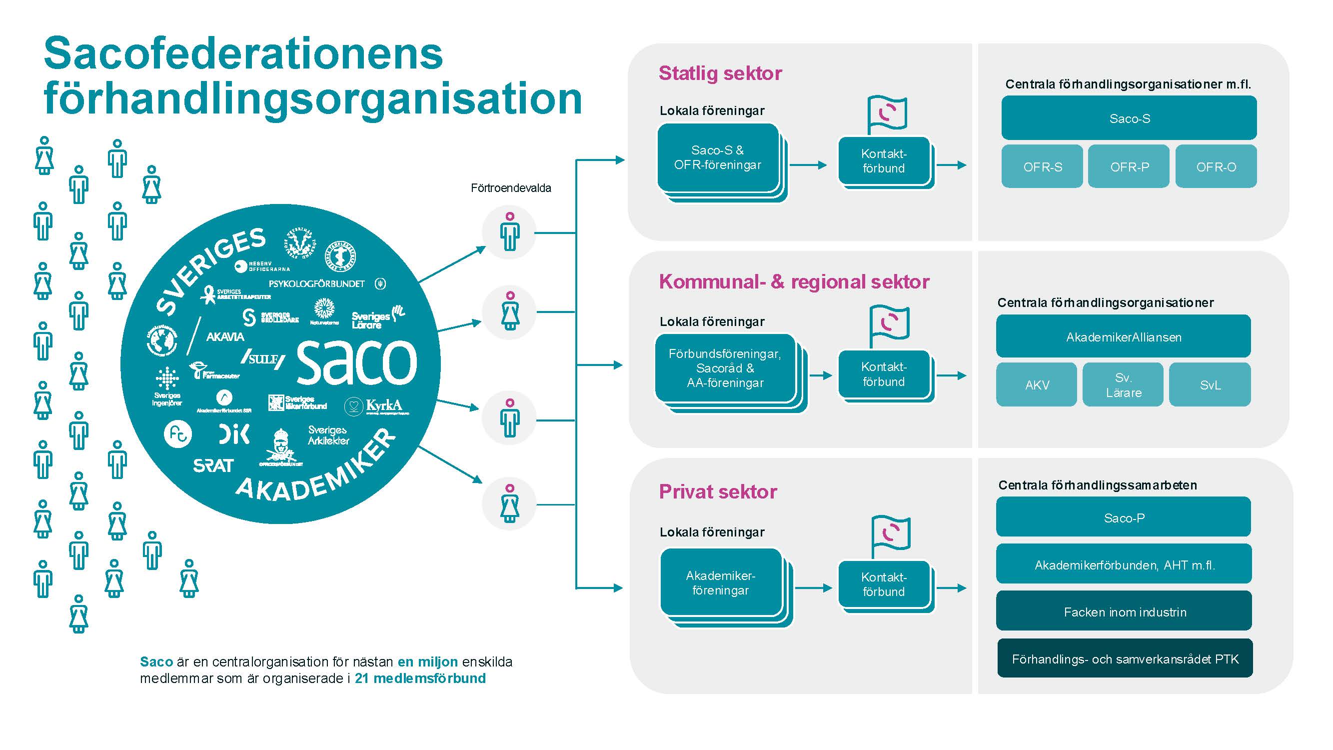 För dig som jobbar statligt finns Saco-S. Det är en förhandlingsorganisation med 18 Sacoförbund. Saco-S förhandlar och tecknar avtal både centralt och på myndigheten. På varje arbetsplats finns förtroendevalda som företräder dig som medlem. Varje förening får också stöd från sitt kontaktförbund. Andra förbund i den statliga sektorn tillhör i stället OFR – Offentliganställdas Förhandlingsråd.